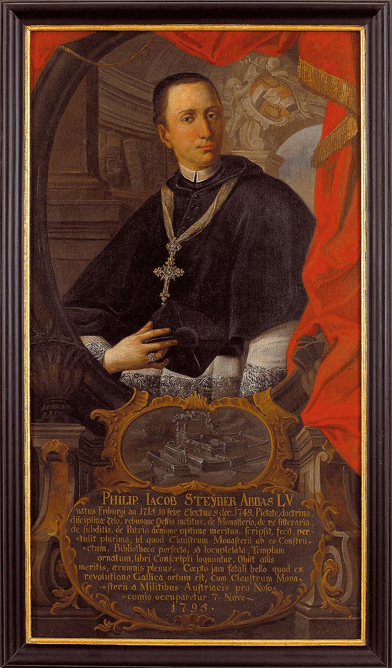 Abt Philipp Jakob Steyrer prägt das Kloster St. Peter und seine Herrschaften in der zweiten Hälfte des 18. Jahrhunderts als Gelehrter, Förderer der Wissenschaften und als Bauherr. Er vollendet den Bibliotheksneubau und baut auch den Ostteil der Klosters gemäss den ursprünglichen Planung. Die Bibliothek wird von ihm mit grossen Zukäufen bereichert. Er selbst veröffentlicht über 50 eigene Werke. Das Klostergymnasium wird zu einer der modernsten Schulen umgeformt. Die habsburgische Klosterpolitik veranlasst ihn, sich als Hauskloster der Zähringer vermehrt deren Nachfahren, den Markgrafen von Baden zuzuwenden. Nur sieben Jahre nach seinem Tod wird dann aber Baden sein Lebenswerk zerschlagen. |